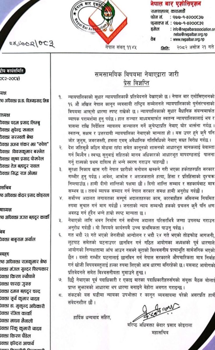 काठमाडौं : नेपाल बार एसोसिएसनले जेनजी आन्दोलनका घटनामाथि छानबिन गर्न गठित उच्चस्तरीय न्यायिक आयोगको निष्पक्षतामाथि प्रश्न उठाएको छ।